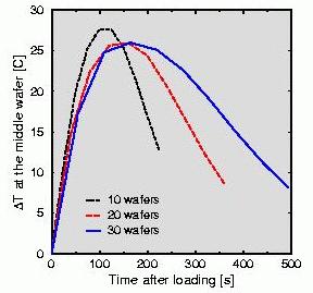 | Center temperature and temperature difference at the middle wafer for various wafer numbers. |