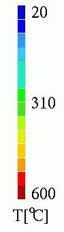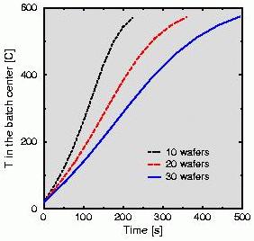 In this study we investigated the heat-up of a batch of 10 silicon wafers (diameter 300mm, spacing 25mm). The wafer batch is loaded at room temperature into a vertical furnace which has been pre-heated to 600C. During the first 225s after loading the wafers heat up to 600C. The water-cooled bottom flange of the furnace remains at room temperature. During the heating-up temperature gradients appear at the wafers. Additional simulations were executed with 20 and 30 wafers for the same batch length.