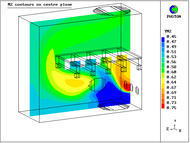 7. Contours of N2 mass concentration at centre plane