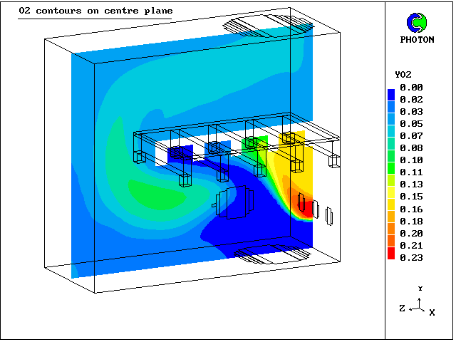 6. Contours of O2 mass concentration at centre plane
