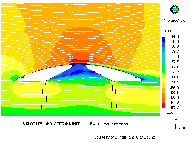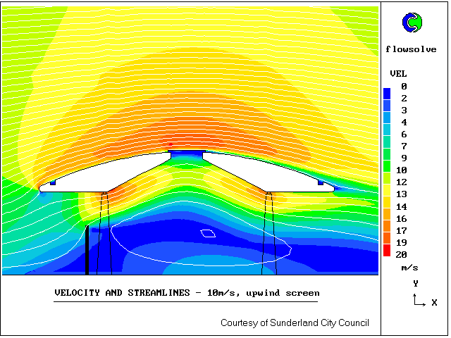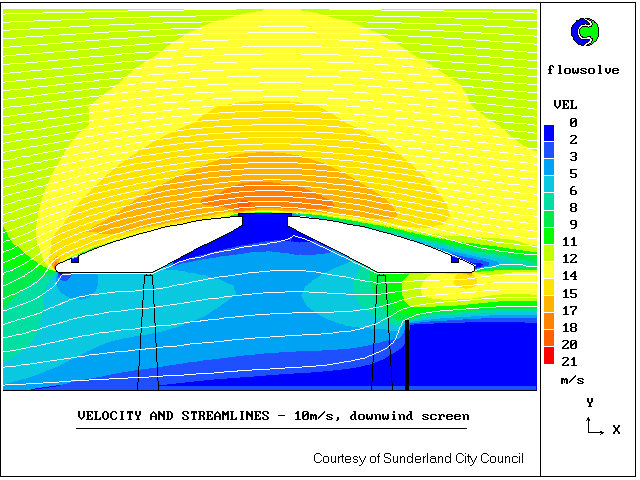 This work was commissioned by Sunderland City Council, who were concerned that wind effects in the new Park Lane Transport Interchange should not be uncomfortable for passengers. PHOENICS was used to predict wind velocities beneath the bus station canopy, both with and without protective screens.
