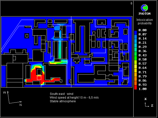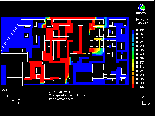 (south-east wind direction, wind speed at height 10 m - 4.5 m/s, neutral atmosphere).