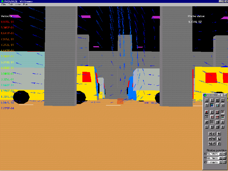 ° C. The floor is held at 22° C. The ceiling vents and main entrance and exit are held at atmospheric pressure, with an external temperature of 20° C.Four rows of three parked vehicles are considered. A single pollution source is located near the rear of one of the vehicles - the engine has been left running. At this location, the temperature is fixed to 30