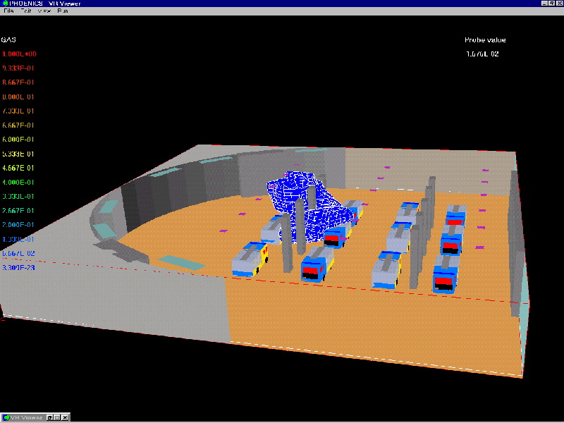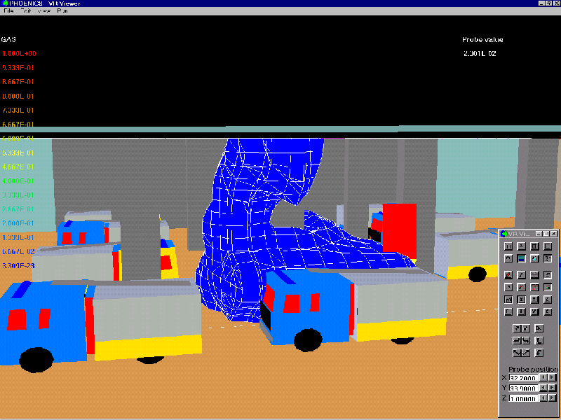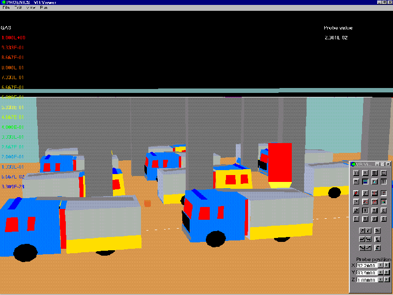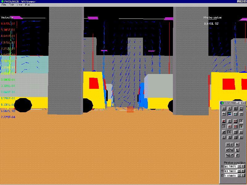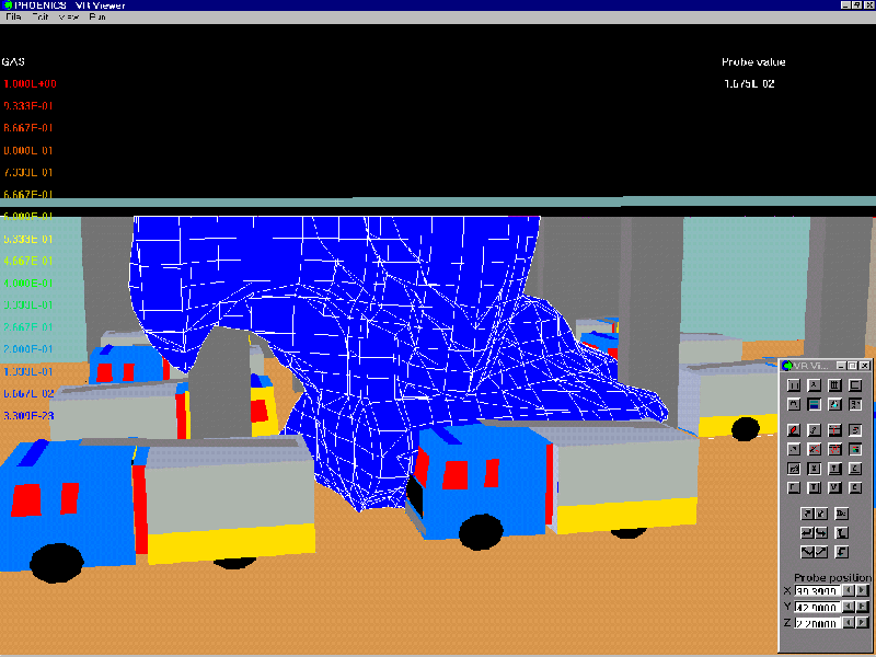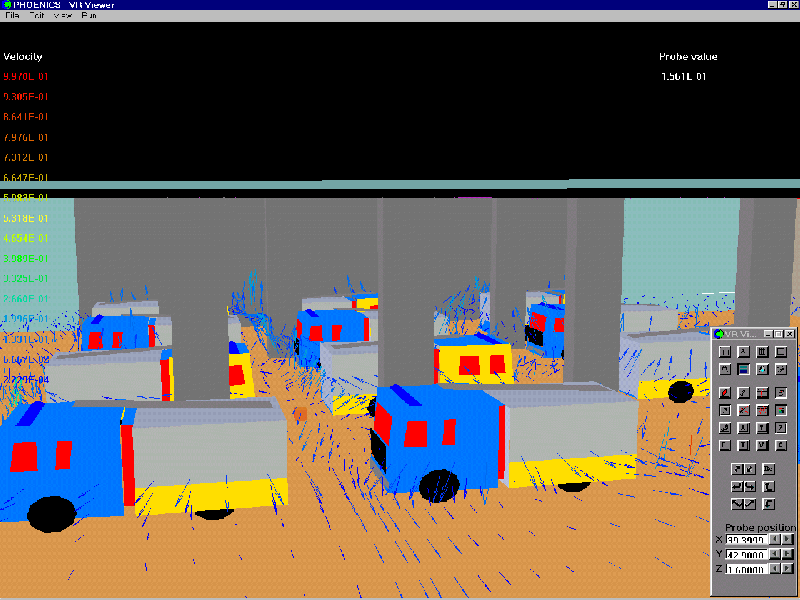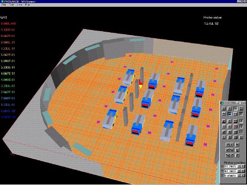 The geometry is created using PHOENICS-VR. An area 70m wide by 70m deep by 10m high is considered. A non-uniform Cartesian grid of 50*50*15 cells is used. Equations are solved for pressure, three velocity components, the temperature, and a pollutant gas concentration. Turbulence is modelled using the standard k-