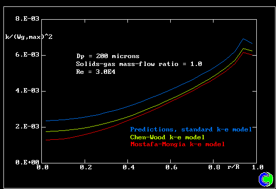 GAS-PARTICLE PIPE UPFLOW: Turbulence-energy radial profiles.