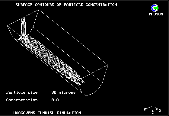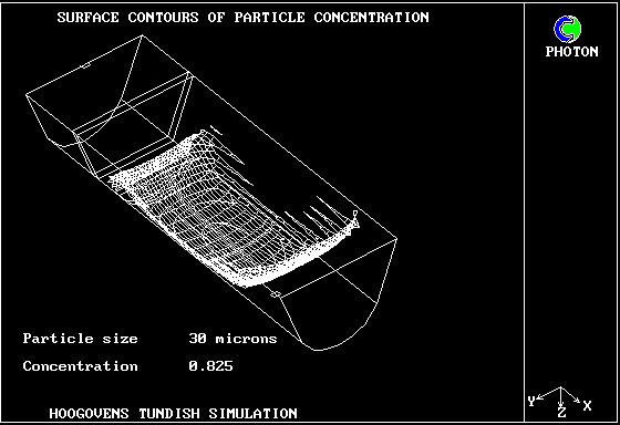 2. Surface contours of particle concentration - WITH DAM AND WEIR - Particle size 30 microns, concentration 0.825