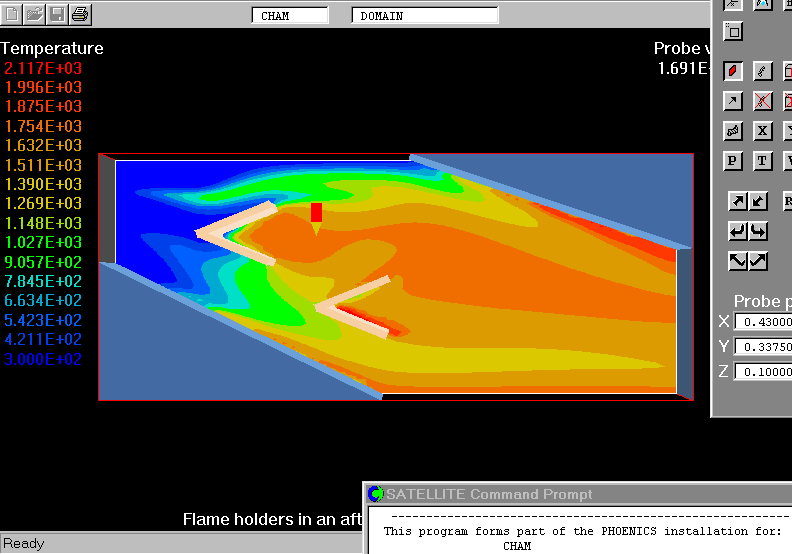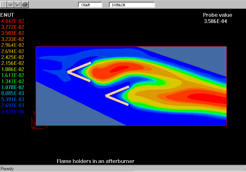 The demonstration case considers the turbulent two-stream diffusion flame in a 2D model of afterburner. Two flameholders placed in the flow are of the open-mouth-type V-gutters.