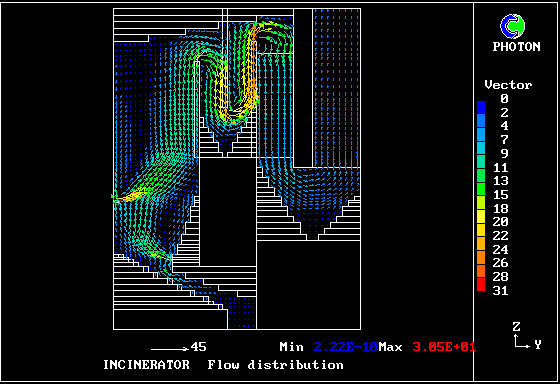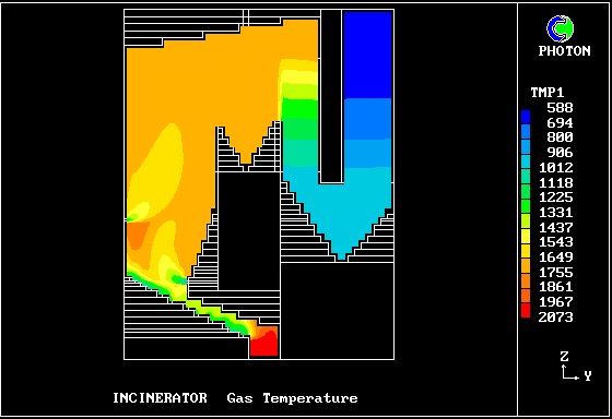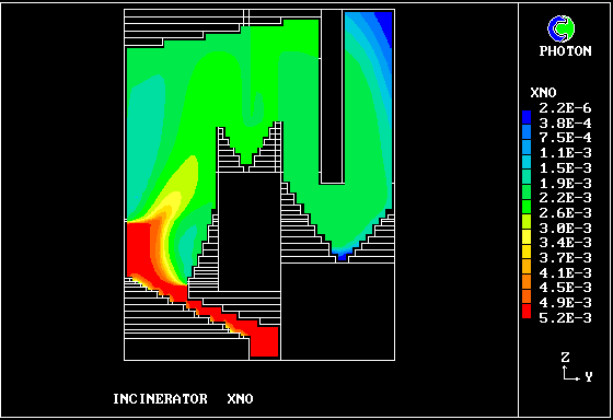 1.Flow generated in a typical refuse incinerator.The air flow is approximately 18 m^3/s with one third of this being introduced as secondary flows. 2.Combustion takes place on and above the angled grate and heat is extracted from the flow by tubed water boilers.Total heat generated by combustion is about 60MW. 3.Thermal NOX calculation showing concentration of nitric oxide