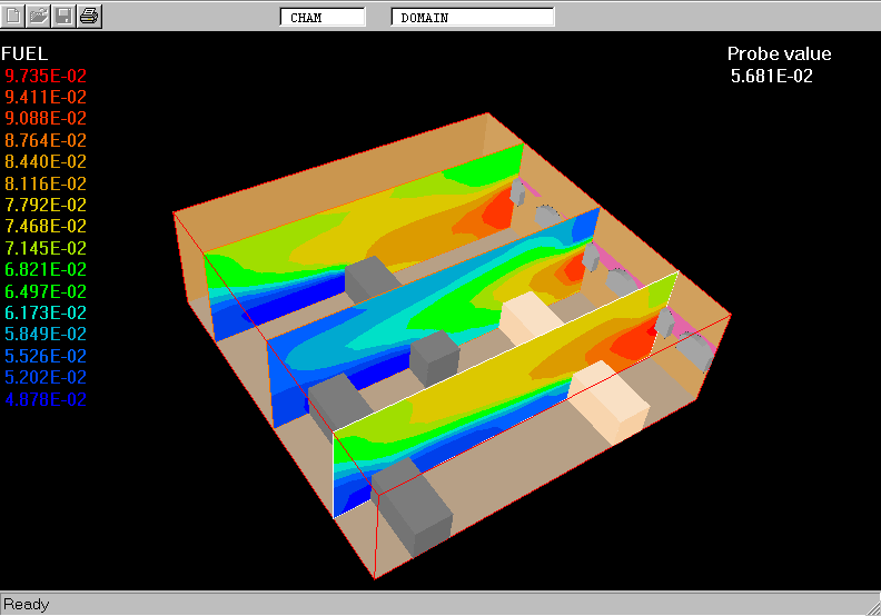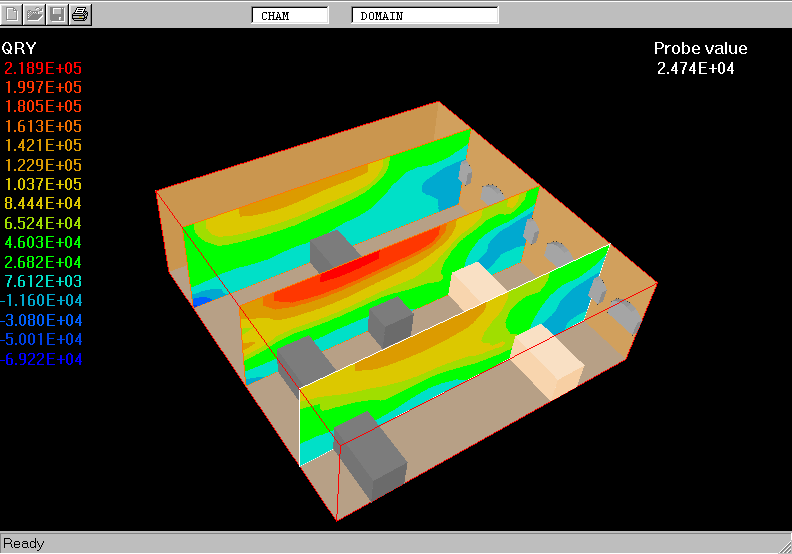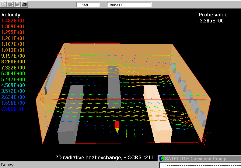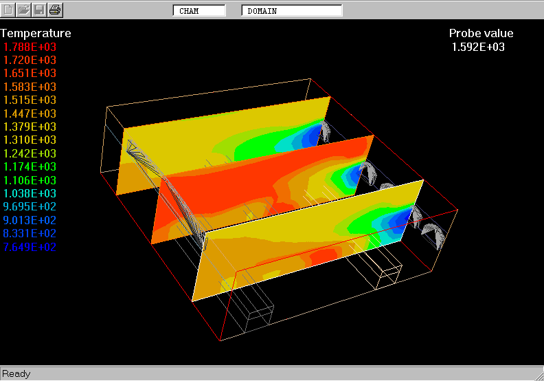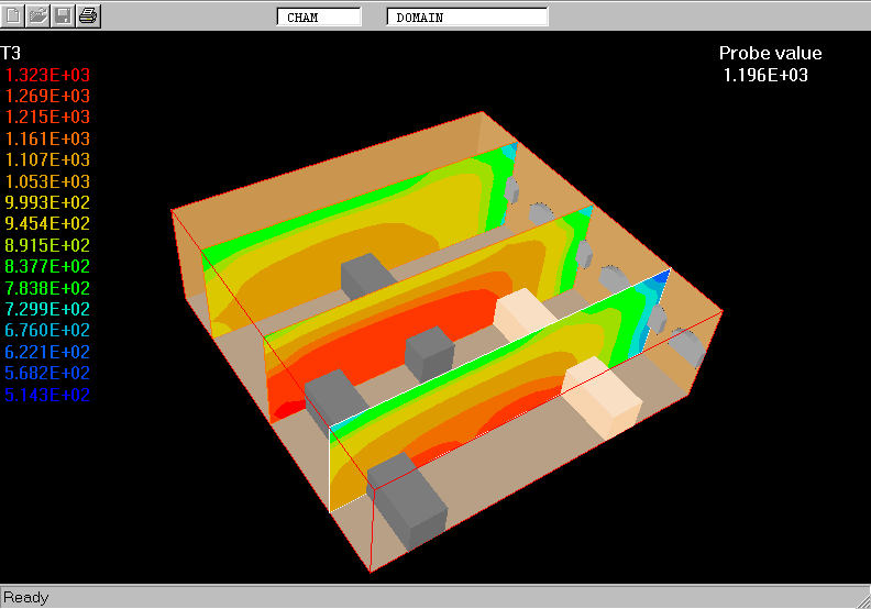 The IMMERSOL model is used to simulate the distribution of T3 within the space filled with combustion gases and solid blocks. From the temperature fields the radiant heat fluxes, QRX, QRY and QRZ, W/m^2, are calculated and used as the heat sources for H1 in iterative manner.