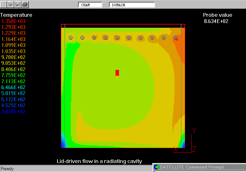 The plots show the distribution of the velocity vectors, temperature and X-, Y-direction radiant heat fluxes within the enclosure.
