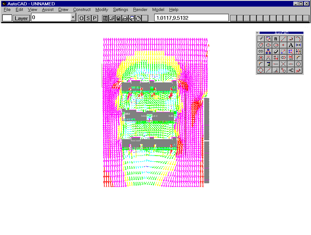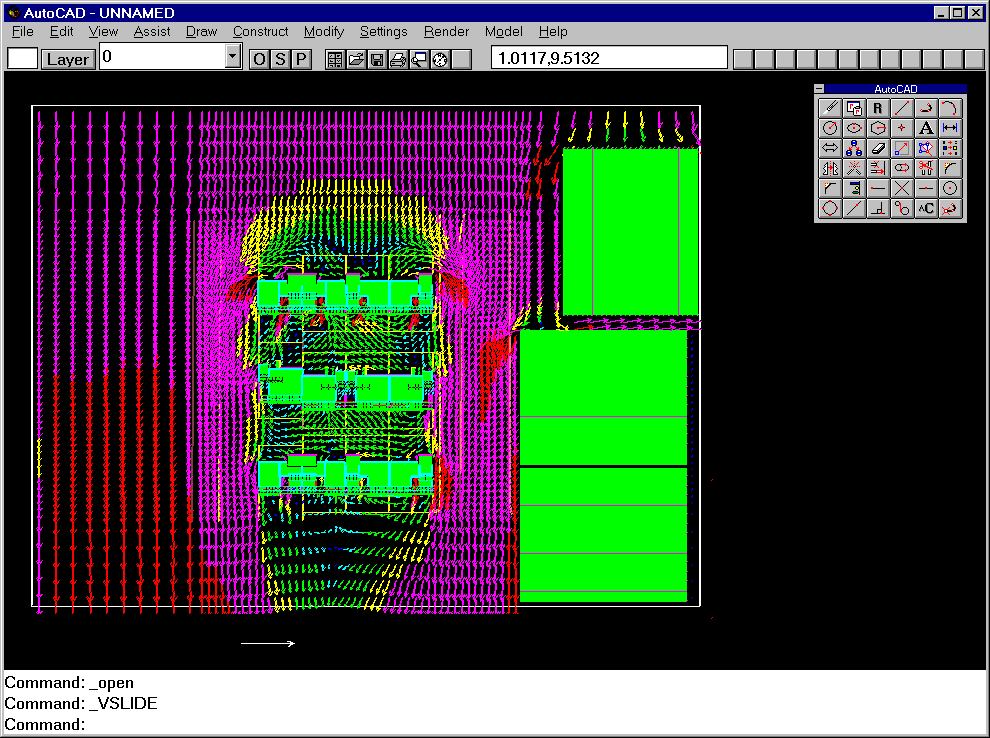 Velocity vectors in the vicinity of buildings, imported from PHOENICS into AUTOCAD