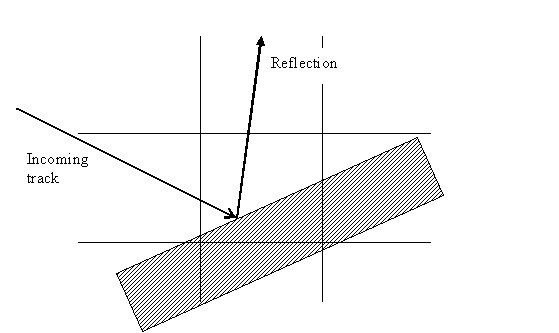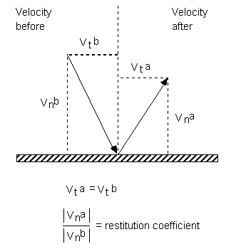 When a particle tries to cross into a wall or obstacle during a time-step, GENTRA will reduce the time-step so that the particle is placed on the wall or obstacle surface. If the user has specified that the particle is to be bounced with a given restitution coefficient, the particle velocity is modified as follows (see figure 6.1):
