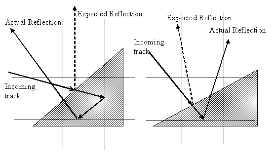 In cylindrical polar grids, the reflection may not be correct as the particle is bounced from the underlying solid cells, not the sloping surface.