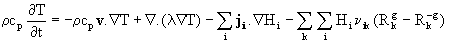 where Hi is the species molar enthalpy and cp is the mixture specific heat. The third term on the right hand side represents diffusion of energy associated with the inter-diffusion of species and the final term the energy associated with the creation and destruction of species by the chemical reactions.