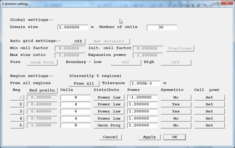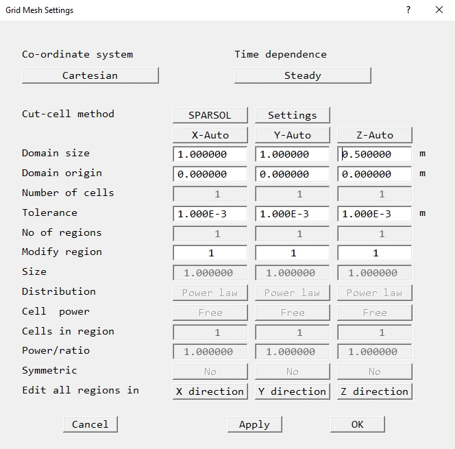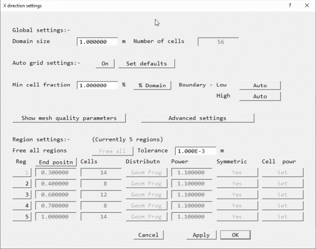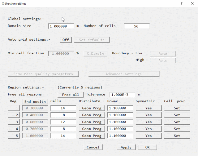 On the Grid Direction Setting dialog, click 'On' next to 'Auto mesh settings:- to turn the auto-mesher off. The grayed out region settings will become active as shown.