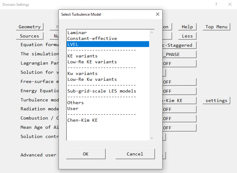 Click on the 'Turbulence models' button to bring up a list of available turbulence models as in figure 7.