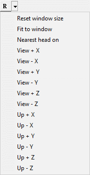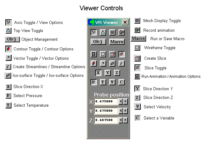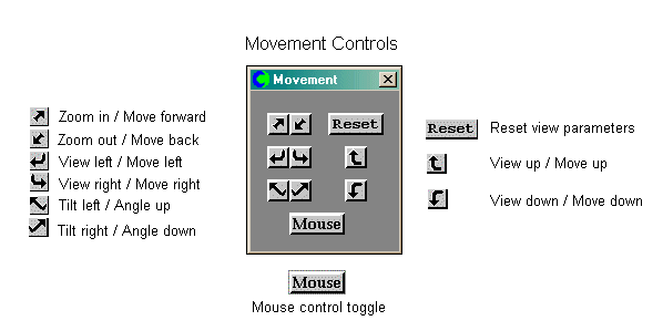 All of the viewing controls are summarised in figure 3a. Some viewing controls have two functions, depending on which mouse-button is used to pick them. In the figure, the function activated by the left mouse button is listed before the slash, and the function activated by the right mouse button is listed after the slash.