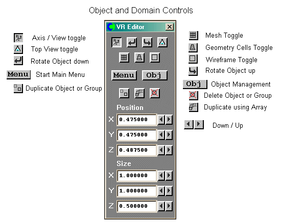 The control features of the VR Editor hand set are now briefly discussed. The hand-set is divided into two separate parts - the movement controls and the domain and object controls.