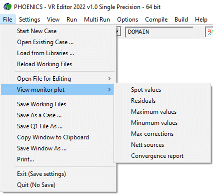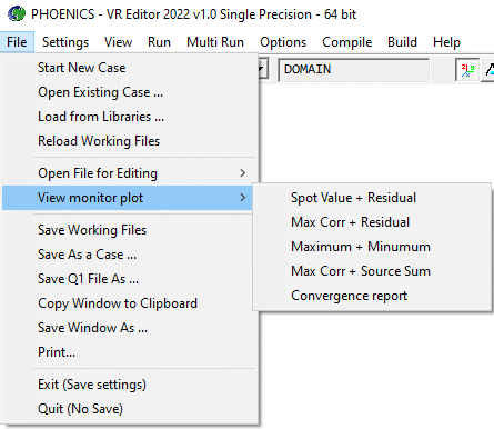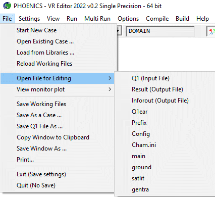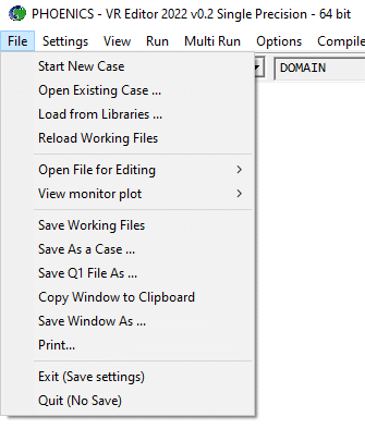 Start new case, Open existing case, Load from libraries, Reload Working files, Open file for editing, View monitor plot, Save working files, Save as a case, Save Q1 File As, Copy Window to Clipboard, Save Window As, Print, Exit, Quit