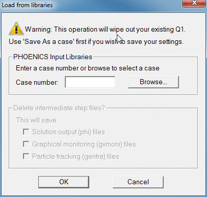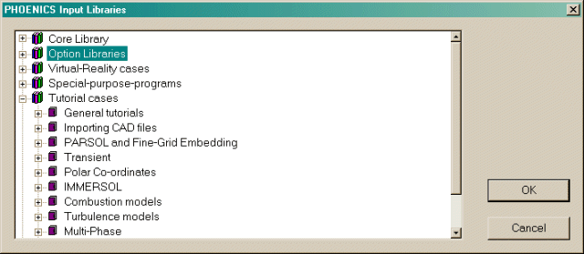 The dialog box below allows a case to be loaded from one of the PHOENICS libraries.