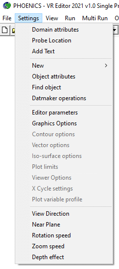 This section describes the menus and dialog boxes available from the top bar of the main VR-Editor/Viewer graphics window. In some cases, the same functions can be accessed via the icons on the tool bar.