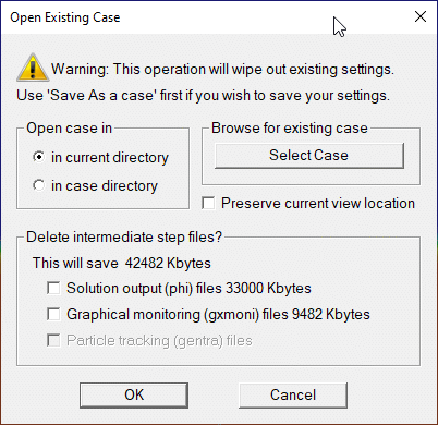 A dialog box is opened requesting the user to confirm that an existing case is to be opened. Before the dialog is opened, a check is made to see if intermediate step or sweep files are present (see Main Menu - Output, Field Dumping for information on how to save intermediate files). If they are present, the dialog will also ask whether to delete the intermediate files.