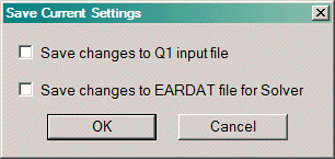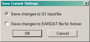 By default, the Q1 file on disk will be used if there is already a RESULT file present, and the RESULT file is newer than Q1. This implies that an Earth run has already been made. In that case, the Q1 on disk is likely to be the one used for the solution. If there is no RESULT file present, the default is to overwrite the Q1 on disk with the current setup before saving the file.