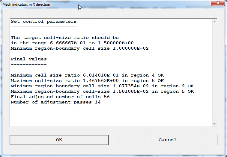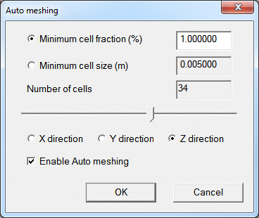 Moving the slider to the left will reduce the minimum cell fraction or size and hence increase the number of cells in the selected direction. Moving it to the right will increase the minimum cell seize and hence reduce the number of cells. Alternatively, an exact value for the minimum size can be entered into the data input box, and the number of cells will be updated. The box showing the number of cells is display-only. It is not possible to directly enter a specific number of cells.
