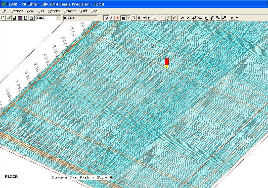 An example is shown by the following picture which shows the automeshed grid for the simulation of what happens when a car catches fire in a car park. The car, one might suppose, is of greatest interest, and so should have the finest grid. However automesher has paid attention to the numerous small ventilation apertures in the car-park wall; and, precisely because of their smallness, has created a grid which fits them.
