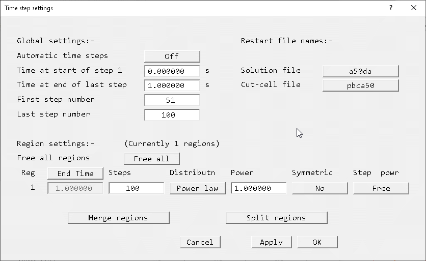 Time can be divided into regions by the Split Regions button. Within each time region, the number of time steps can be set, together with a geometrical or power-law size distribution.