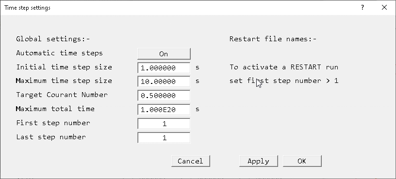 For manual time step setting, in the 'Time at end of last step' box, enter the new extended end time of the run. Leave 'Time at start of step 1' at zero. In the 'Last step number' box, enter the new total number of steps. In the 'First step number' box, enter the previous last step+1. A dialog will appear asking if a restart is to be activated. Click 'Yes'. The restart will be activated, and the names of the restart files will be deduced from the start letter chosen for saving the intermediate fields.