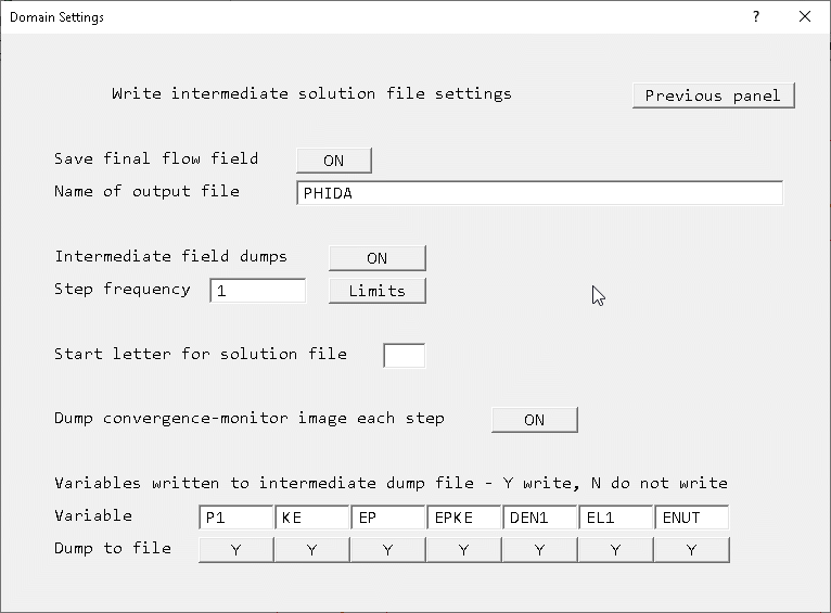 The size of the intermediate files can be reduced by choosing not to dump each variable to the file. Changing the Y to an N in the 'Dump to file' line will prevent that variable from being written to the intermediate file. If the property-marked variable, PRPS, is so excluded, Viewer will not be able to determine which cells are blocked. Depending on which variables are excluded, it may not be possible to restart the calculation from the intermediate files. All variables are written to the final solution files (PHIDA or PHI and PBCL.DAT) regardless of the dump settings.