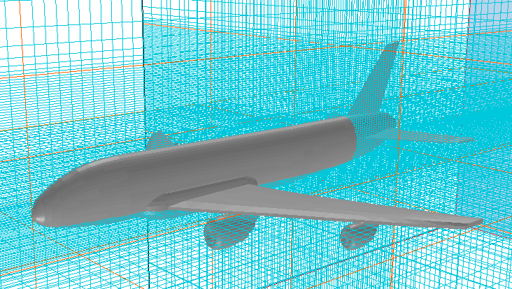 (1) A user acquainted only with non-aeronautical applications of PHOENICS might suppose that it suffices to represent the airplane's shape by means of an stl file, its flight speed by upstream and downstream inlet and outlet objects, and its engine intakes and exhausts similarly; and then to choose a very fine Cartesian grid, into which the highly-non-Cartesian airplane would be fitted automatically by the easy-to-activate PARSOL technique. Then parallel-computing mode could be adopted so as to reduce the time needed to arrive at a converged solution. The following image shows an airplane in such a grid.
