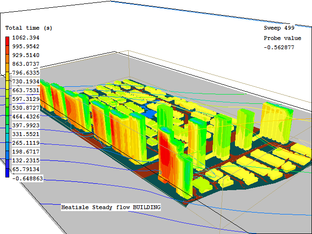 It is item d. which makes the problem in one respect more challenging to the user than the aircraft-drag one: he/she has always to extract from the information supplied to him/her the few items which are relevant to the question to be answered. This will have been done in the simulation shown below, which concerns the computed fire spread in a spirally-shaped car part in Annecy, France. Had it not been, the computations would have been immensely more expensive: but provided no better insight.