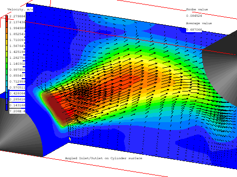The active Inlet/outlet area is the area of intersection of the ANGLED-IN/OUT object with any blockage object. In the image below a cylindrical ANGLED-IN object is intersecting a quarter-cylinder blockage.