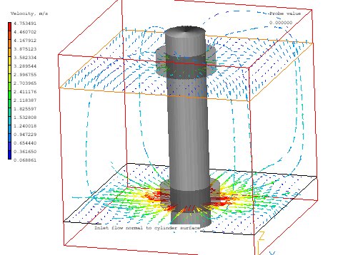 The inflow can be specified as Cartesian velocity components (as above), velocity normal to the blockage surface (as below), or as volume or mass flow rate.
