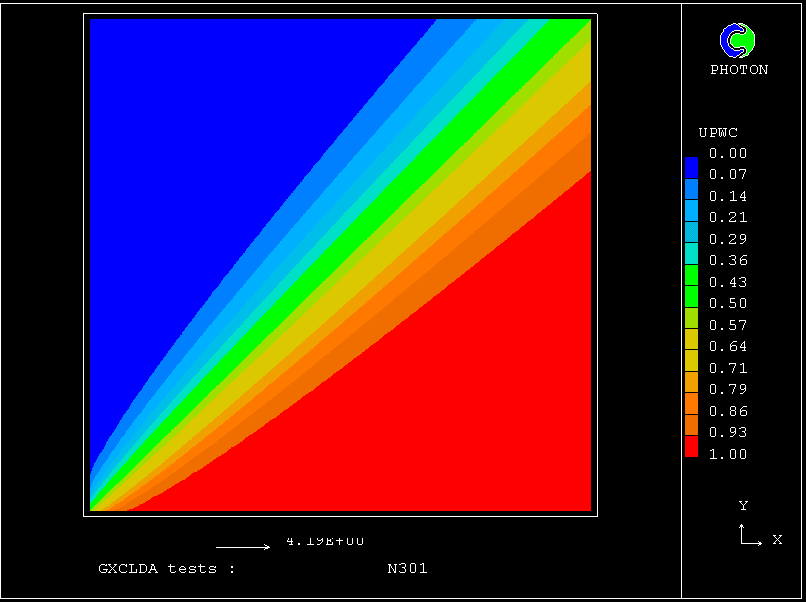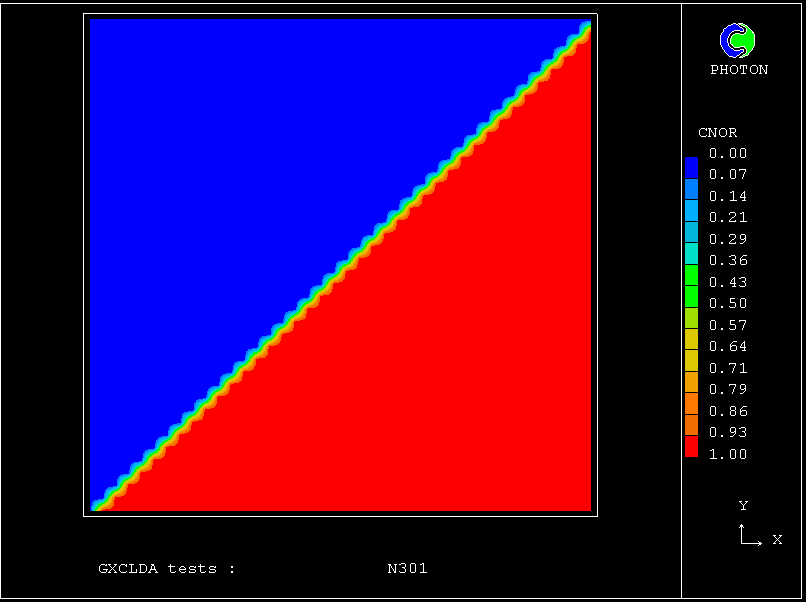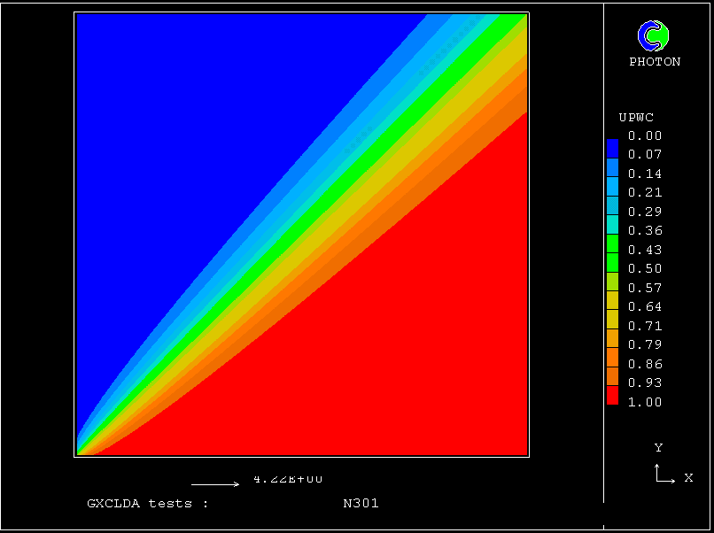 PHOENICS Input-Library case N301 concerns diagonally-directed flow across a square grid, from south-west to north-east, wherein the fluids entering through the west and south faces each have uniform but different values of a passive scalar of which the diffusion coefficient is zero.