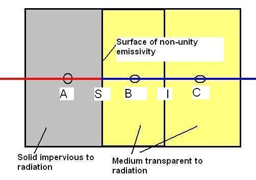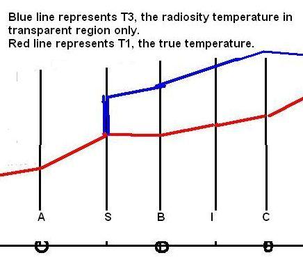 However, the calculation of the radiant flux at the S interface requires more careful study because the surface emissivity can cause a discontinuity of T3 gradient there, as is illustrated in the following figure, which shows the postulated profiles of both T3 and T1 because of their inescapable interaction.