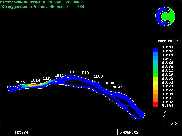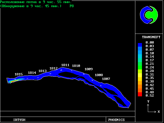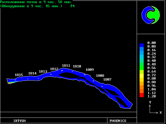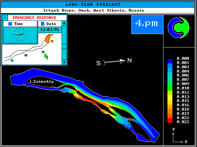 The movement of oil on the surface of the River Irtysh subsequent to a spill for a wind conditions is shown on the next panels.