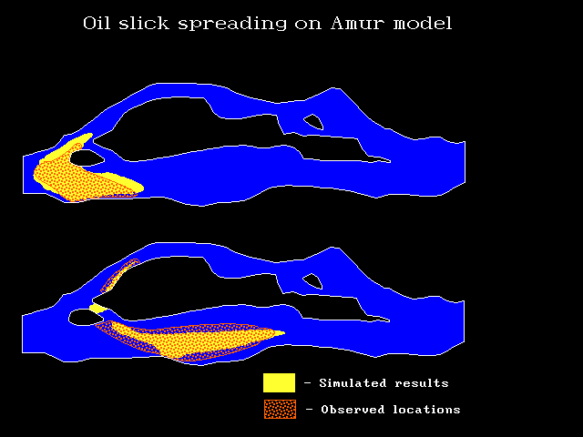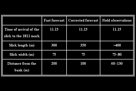 The photos of oil slicks at different time moments compared favourably with the locations and shapes of predicted slicks.