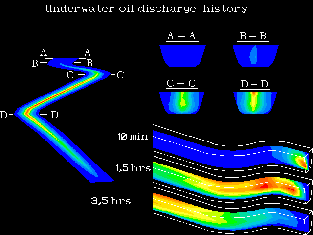 The case above was simulated to illustrate the three-dimensional effects of unsteady spatial distribution of the oil concentration in the water body.