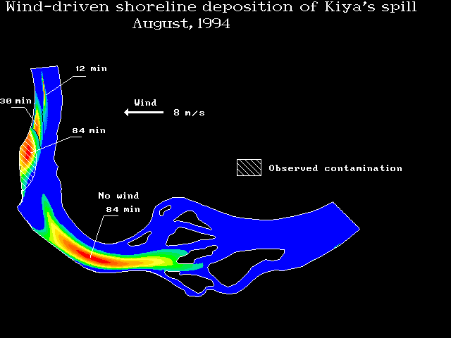 The upper picture on the previous panel shows the observed and predicted slick location 3 days later after the spill.