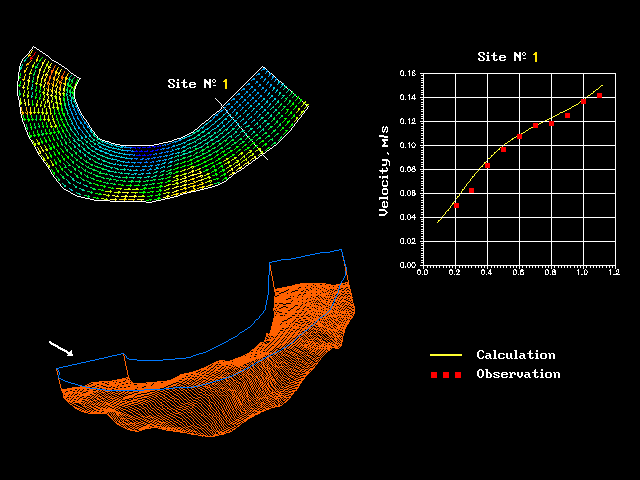 The considerable attention has been given for comparison model velocity fields with data of hydrological field measurements in real river conditions. Two examples illustrate rather typical comparisons.