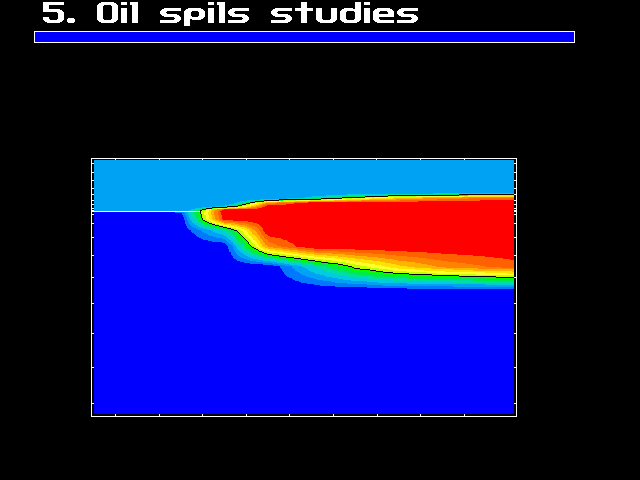 The pictures show the history of oil concentration field under influence of buoyancy, flow discharge and the river course.