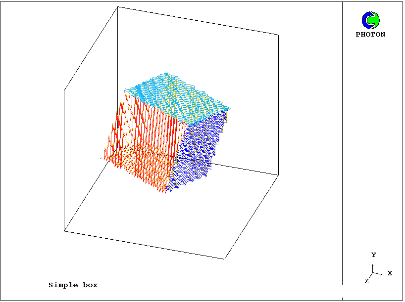 Library case 383 illustrates the use of the box function for the creation of a box in a cubical domain, with all its rotations equal to 0.25 radians. A photon plot is shown here, created by the sur mark x 0.99 and sur mark y 0.99 commands.