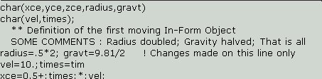 Echo InForm settings for Group 13 inform13begin char(xce,yce,zce,radius,gravt) char(vel,times); ** Definition of the first moving In-Form Object SOME COMMENTS : Radius doubled; Gravity halved; That is all radius=.5*2; gravt=9.81/2 ! Changes made on this line only vel=10.;times=tim xce=0.5+:times:*:vel: