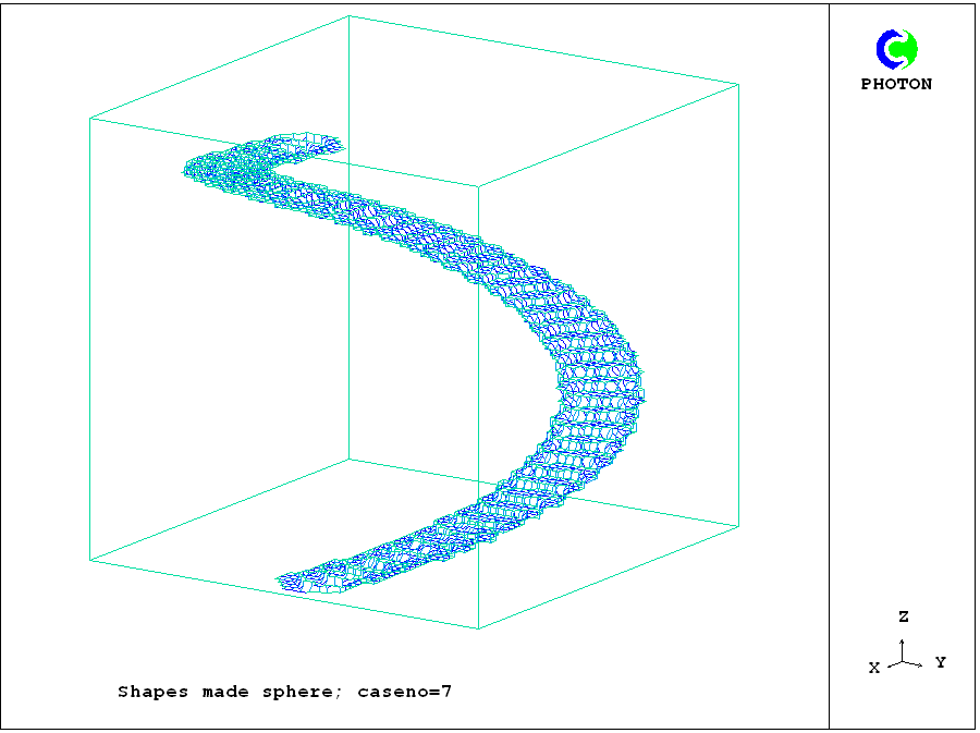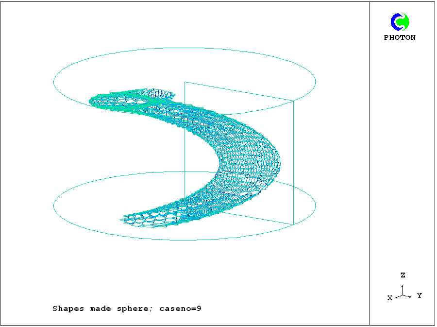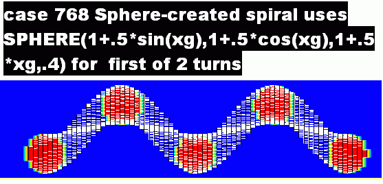 This method, as is seen, uses the angular coordinate xg in the formula; therefore it is necessary to use two spheres for the two-turn spiral shown here. They can however, if desired, be specified in a single INFOB statement, as is explained by comments in the Q1 file of the case.