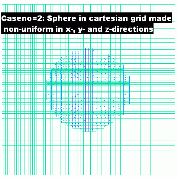 Core Input-File Library case 386 concerns a sphere placed in a cartesian grid with its centre at the co-ordinate axis. Its radius, and the domain dimensions, XULAST, YVLAST and ZWLAST, are all equal to 1m.