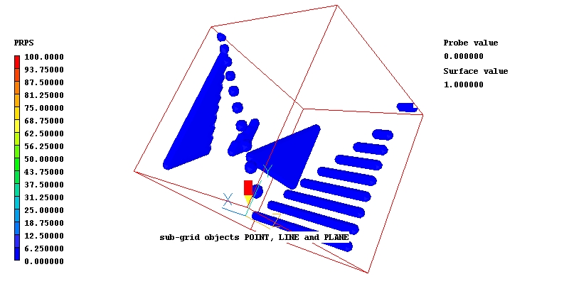 All the objects introduced in case 385 are displayed here by way of surface-value plots of PRPS which is specified as 100 within all the intersected cells.