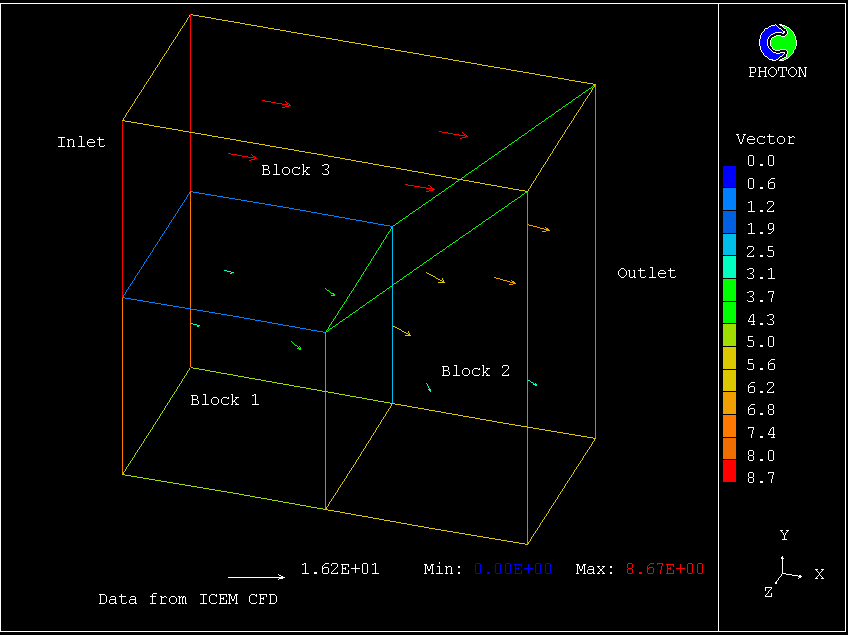 Blocks 1&2 and 1&3 are linked 'naturally' - West to East and Low to High, whilst the link between 2&3 is 'unnatural' - a Low face is linked to a West face. All blocks have a nominal grid of 2*2*2. There is an inlet of 1 m/s in the X direction on the East face of Block 3, and an outlet to a relative pressure of 0.0 Pa on the West face of Block 2.